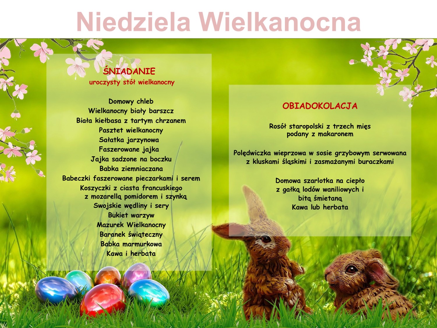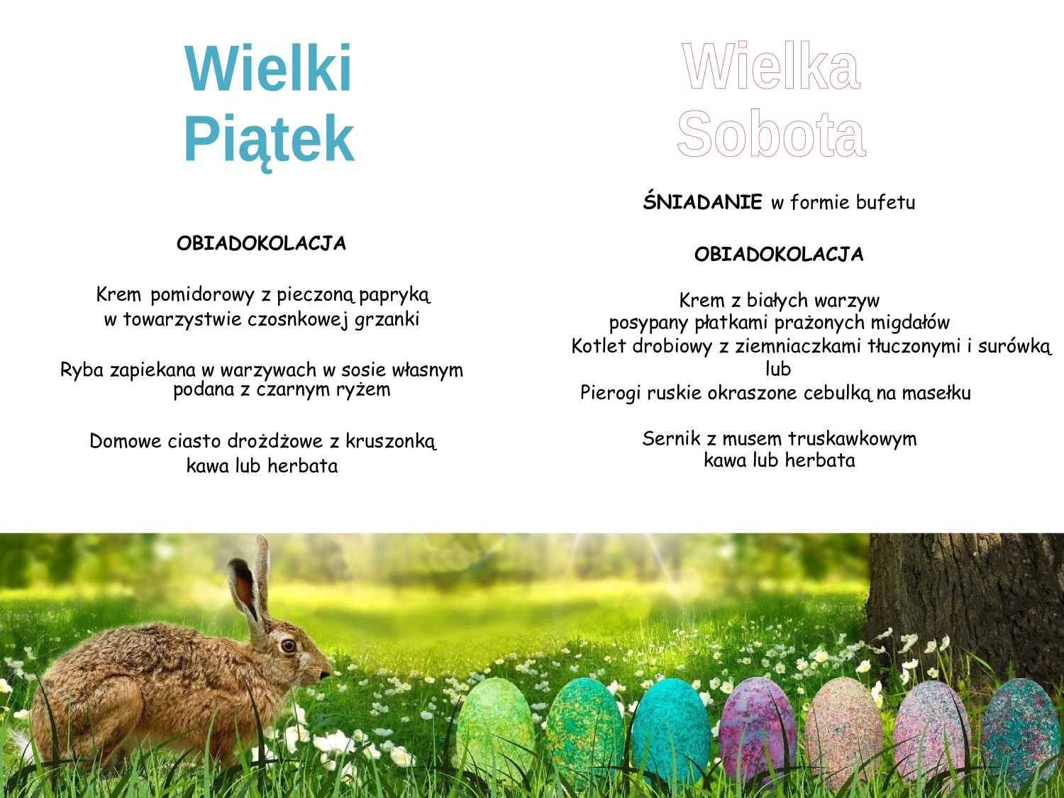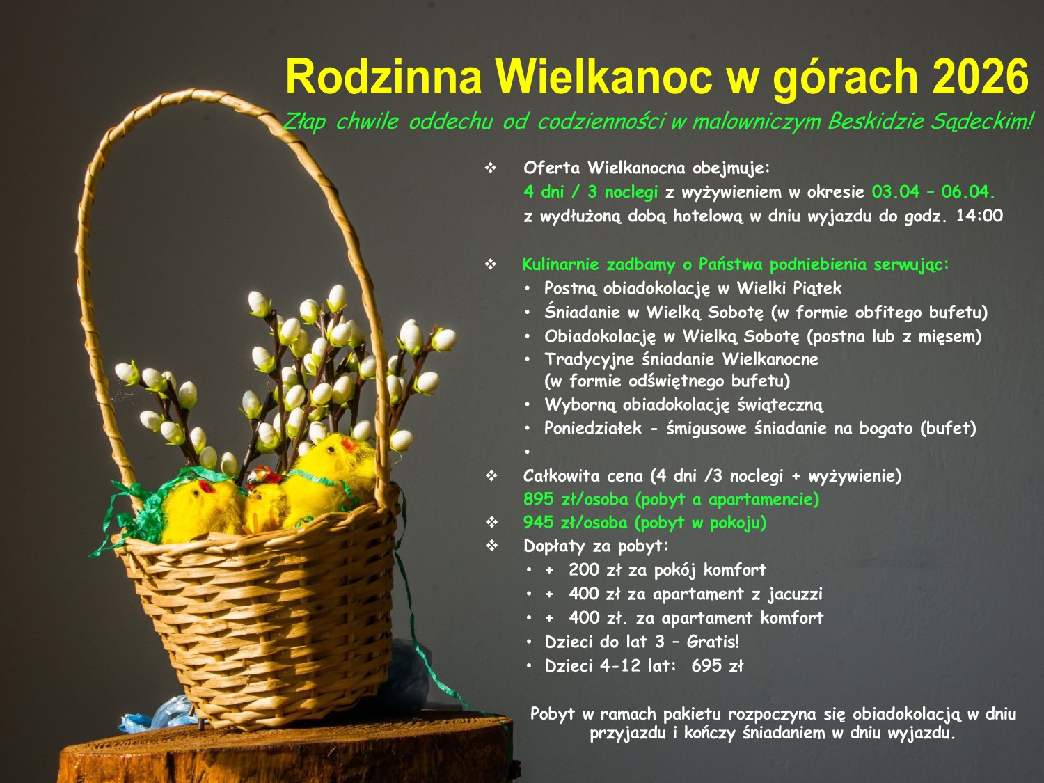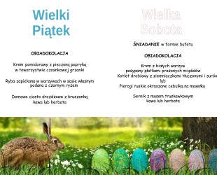Pobyt w pakiecie rozpoczyna się obiadokolacją w Wielki Piątek, a kończy śniadaniem w dniu wyjazdu i można go dowolnie przedłużać.